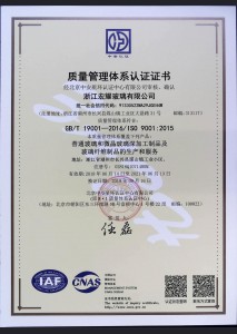 公司擁有現代先進的全電腦控制水平輥道式平、彎異形鋼化玻璃生產線,數控XY玻璃劃片臺,數控水切割機,雙邊磨邊機和進口磨削加工中心,多條雙色全自動印刷流水線,自主研發適合本公司的自動流水線,將前后工序有效連接,大大提高生產效率和產品質量,產能達到灶具玻璃15萬片/月,油煙機玻璃18萬片/月,隔熱新材料180噸/月。公司擁有完善的環境質量管理體系,通過ISO 9001和ISO 14001體系認證,內部設有產品實驗室,產品檢測設備齊全,有玻璃應力儀、透光、強度檢儀,高溫恒溫箱,可程式恒溫恒濕箱等。 生產作業嚴格按照公司內部作業標準和檢驗標準,使生產作業規范化,產品質量滿足客戶要求。
